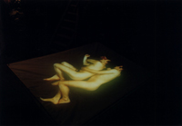 Videoinstallation, 1998 schwebendes Pergamentobjekt (140 x 200cm) Wind, Videoprojektor, Videoplayer CD Player, Lautsprecher Klangkomposition | |