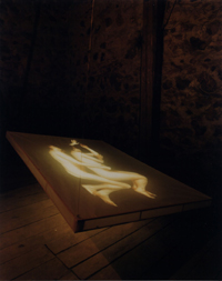 Die Schlafenden![]() Lebensgroß, auf ein Pergamentobjekt projeziert sieht der Betrachter zwei nackte schlafende Männer. Eng umschlungen liegen sie da, atmen, bewegen sich kaum. Nur ab und zu drehen sie sich gemeinsam um, um weiter in vertrauter und intimer Schafposition weiterzuschlafen. Wind bewegt sanft das Pergamentobjekt. Die Klangkomposition in der Höhe des Raumes, wie Fragmente geträumter Sequenzen, zieht den Betrachter weiter in die Dunkelheit des Raumes. Die Installation wurde im Glockenturm einer brandenburgischen Kirche präsentiert, im Stockwerk zwischen Totenhalle und den Kirchenglocken. |