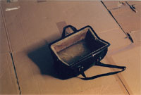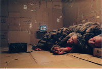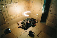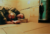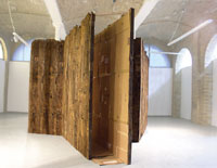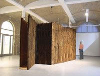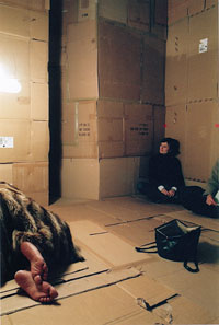 begehbare Raumskulptur mit Live-Darstellern, 2005 Zusammenarbeit mit Christiane Wartenberg Raumkörper aus alten Schalbretter (Chr.W.) Innenrauminstallation mit zwei Darstellern in Pelzmäntel, eine kreisende Glühbirne, eine Handtasche gefüllt mit Wasser, ein Videomonitor Looplänge 3min, Kartonpappen an den Wänden (S.G.) | |