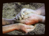 DIE HÜTTE #1![]() Die begehbare Raumskulptur mit Live-Darstellern ist das Ergebnis der künstlerischen Zusammenarbeit der Bildhauerin Christiane Wartenberg und der Installationskünstlerin Susu Grunenberg. Die Hütte ist die erste Arbeit einer Serie von gemeinsam konzepierten Raumskulpturen, die innen wie außen begehbar sind. Eine monolithische Skulptur steht frei im Raum - der Körper eines uralten Gehäuses oder eines futuristischen Gebildes aus fernen Galaxien. Gebaut aus verwitterten Holzbrettern besitzt dieser Körper ein Innenleben, in das die Besucher eintreten können. Innen sind die Wände mit Kartonpappen verkleidet – eine Schutzhülle für zwei Menschen, die in inniger Haltung auf dem Boden ruhen, in Pelzmäntel eingehüllt. Die zwei Darsteller sind Teil eines lebenden Bildes. Dinge schweben um sie herum: eine kreisende Glühbirne, ein Videomonitor. Eine mit Wasser gefüllte Handtasche steht am Boden. Objekte, die sparsam Auskunft geben über ein nicht fassbares Leben, das zugleich unser eigenes zu spiegeln scheint. DIE HÜTTE ein endzeitliches Urbild für das kulturelle Bedürfnis, sich feste Erinnerungsräume zu schaffen. ein unzerstörbarer Kernraum zur Aufbewahrung von Erinnerungen. Die Erinnerung an das Geheimnis zwischen Menschen. | ![]() |