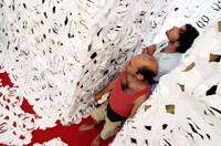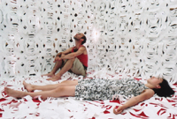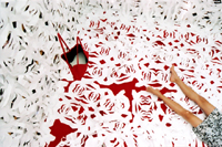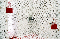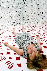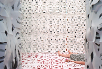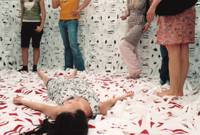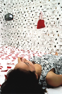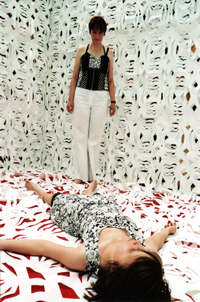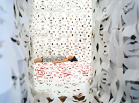 Performative Installation, 2008 mit 17-18 jährigen Darstellerinnen. DIE HÜTTE ist eine Serie von begehbaren Raumskulpturen. (mit Christiane Wartenberg). In dem mit weißen Papierornamenten ausgekleideten Innenraum befindet sich ein liegendes Mädchen. Sie schaut in die Ferne über ihr. Es scheint, dass ihre Augen dort etwas verfolgen wollen. Zwei rote Stofftaschen gefüllt mit Milch hängen frei im Raum und ein schwebender Monitor zeigt die Choreografie von zwei sich begegnenden Händen. |